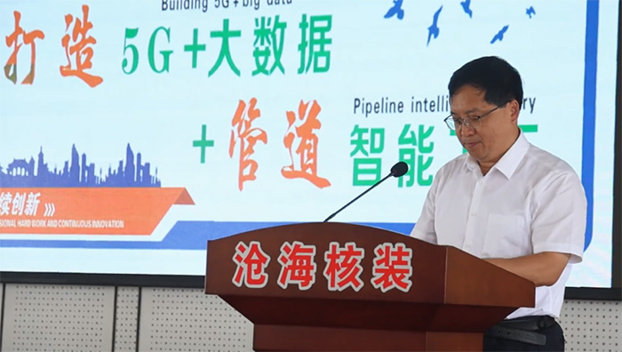 潘佳庭在致辭時指出,近年來,鹽山縣圍繞產業轉型升級,加快智能化生產管理進程,努力推進管道裝備產業向數字化轉型和智能化提升,實現管道裝備產業智能制造、智慧運行。滄海核裝備科技股份有限公司作為我縣高 端管道制造企業,積極響應政府號召,與國內知名科研院所和運營商合作,謀劃了“5G+大數據+管道智能工廠”項目,該項目的實施將進一步加快推動全縣工業轉型升級步伐,為鹽山經濟社會高質量發展注入新的活力。